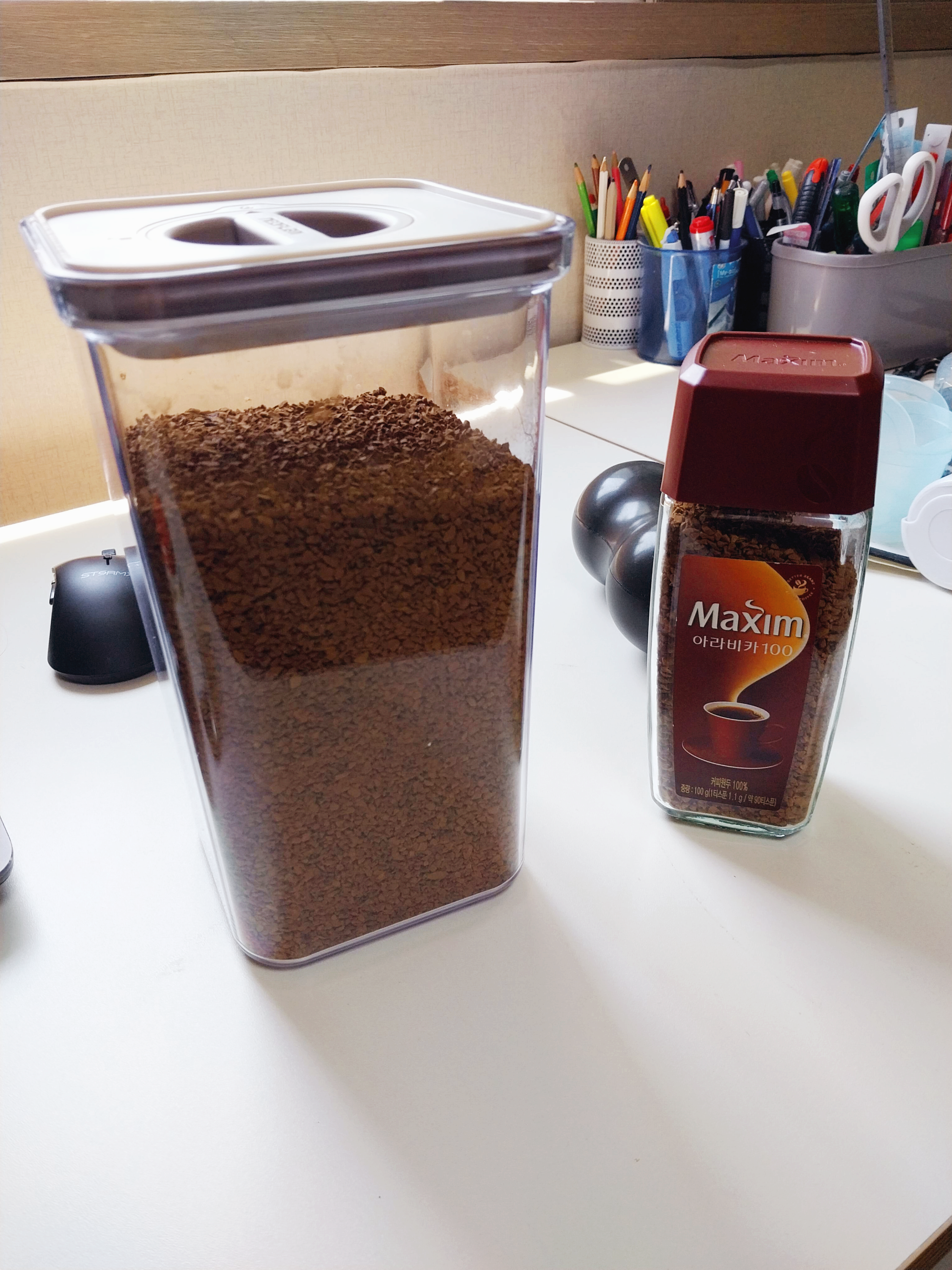 만약 밀폐용기에만 담는다 치면, 500g짜리 인스턴트 알커피 담는데 대략 2.5L 짜리 밀폐용기가 필요할 것 같다. 2.5L에다가 담으면 넉넉하게 담을 수 있을 것 같고, 1.5L 밀폐용기를 2개 사서 나눠서 담을 수도 있겠다.